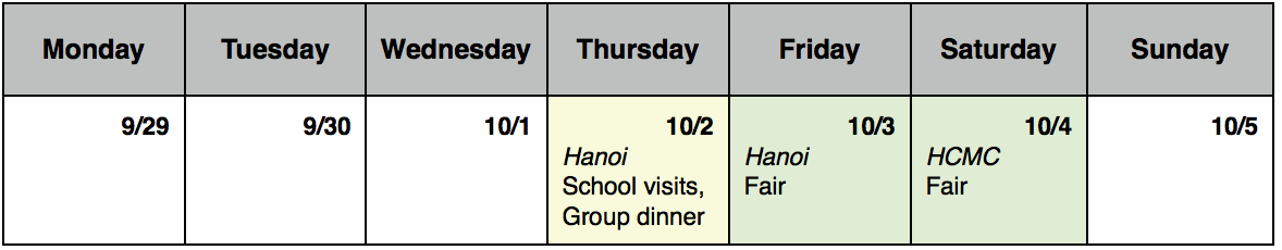 The fall fair will take place in Hanoi and Ho Chi Minh City over a single weekend. The tour is scheduled to be fast and easy, moving from north to south. School visits will be included on the front end before the fair in Hanoi.